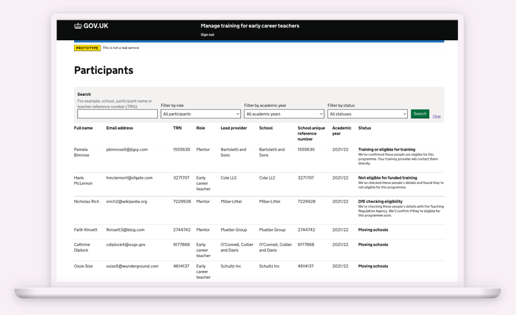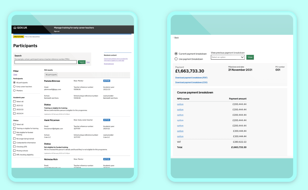 This is part of project was focused on allowing DfE and 3rd party organisations such as training providers and delivery partners to manage data relating to the contractual delivery of professional development (ECF & NPQ). This was a fundamental part of the program in order to ensure the organisations were paid in order to provide the professional development for teachers and mentors.