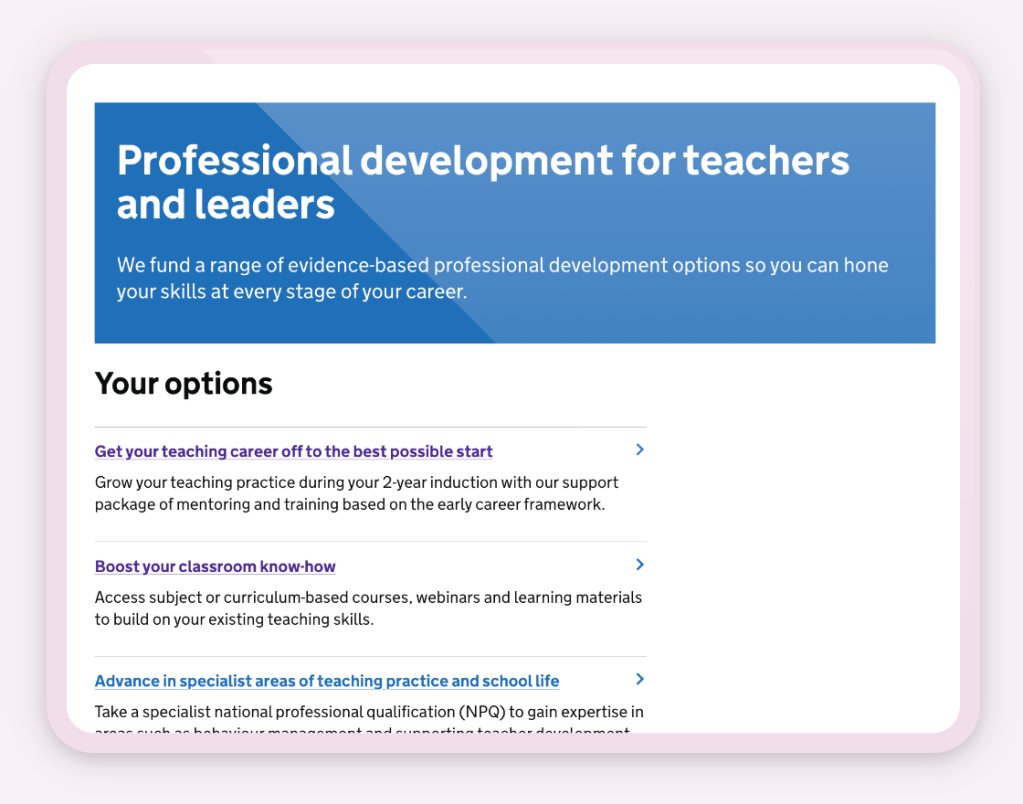 The way teachers and leaders understand professional development and career progression is an unknown for the DfE. The teams vision was to surface actionable opportunities of all sizes to enable more teachers to benefit from professional development that is right for them.