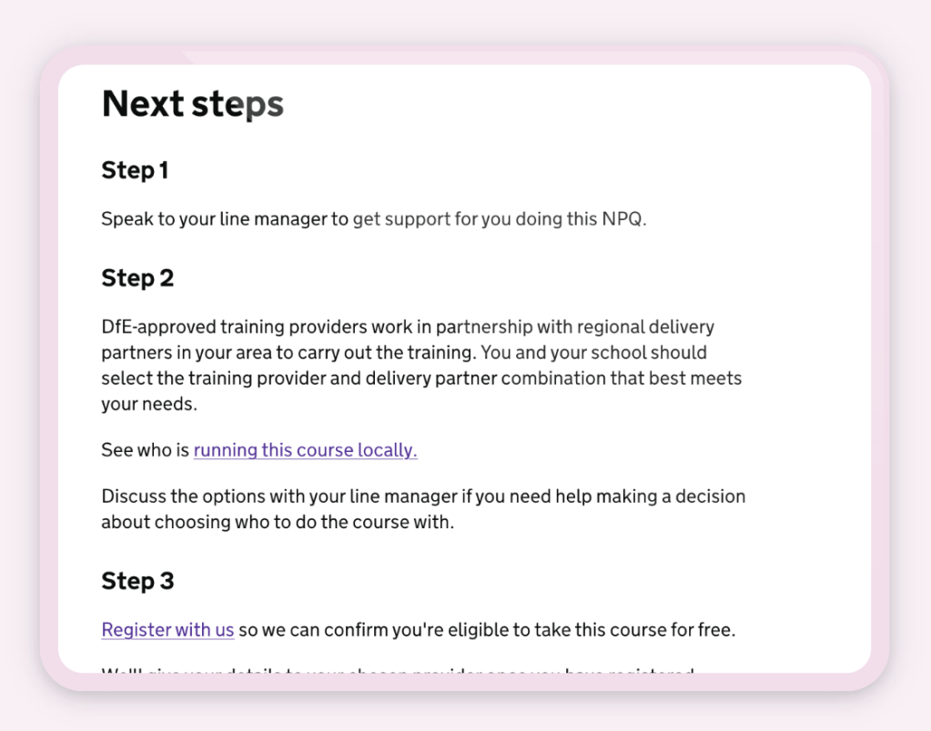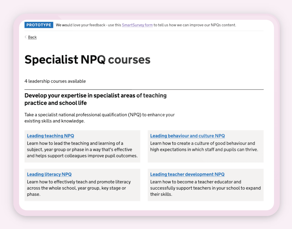 Coordinators were an audience highly aware of professional development opportunities with different needs to teachers. They expected DfE professional development to be presented by policy area (ECF, NPQ, behaviour hubs etc.). Seeing career-path-focused categories hindered their navigation through the prototype. An area of particular confusion was splitting up NPQs into 2 categories. The NPQ detail pages were well-structured and useful.